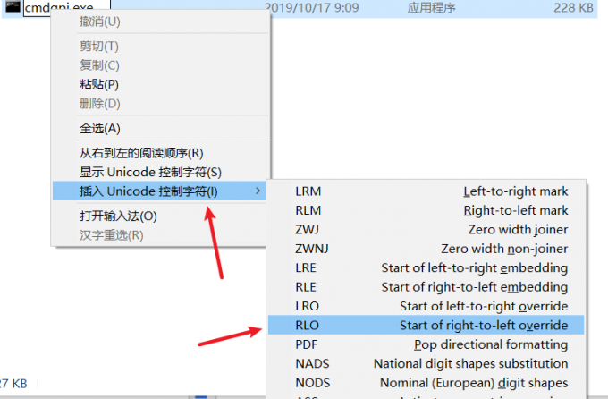 RLO,即Right-to-Left Override,我们可以在⽂件名中插⼊此类unicode字符,来达到⽂件名反转的效果。